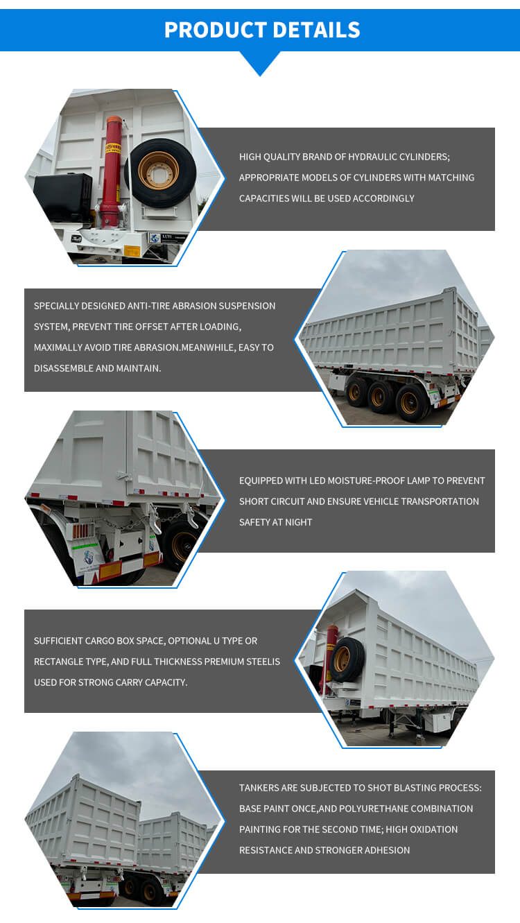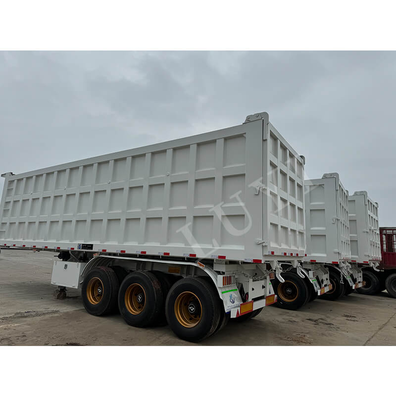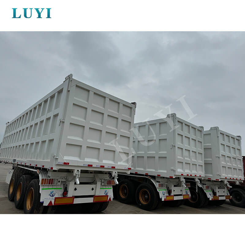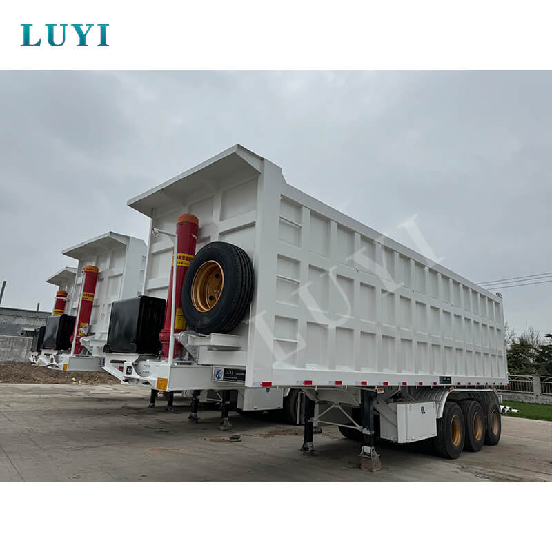 Este semirremolque de descarga trasera hidráulica de 3 ejes y 40 a 60 toneladas de LUYI está diseñado para el transporte de arena y grava. Originario de Shandong, China, está construido con acero de alta calidad para soportar cargas pesadas, con una carga útil máxima de más de 30.000 kg.