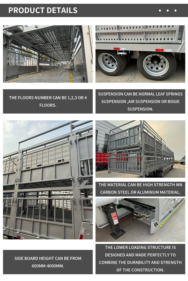 Construido con material de aleación/aluminio, el remolque es liviano pero duradero, con una carga útil máxima efectiva de más de 30,000 kg para satisfacer fácilmente las necesidades de carga pesada. Para los ejes, puede elegir marcas de alta calidad como FUWA, BPW y CIMC de 13/16 toneladas. Combina neumáticos en varias especificaciones, como 11.00r20, 12r22.5, 315 y 385, mientras que el sistema de suspensión ofrece dos opciones: suspensión mecánica y suspensión neumática, lo que garantiza una conducción estable en diversas condiciones de la carretera. El color se puede personalizar según los requisitos del cliente y también viene con un servicio posventa de 1 año, que satisface completamente los escenarios de transporte y las necesidades personalizadas, lo que lo convierte en una opción ideal para el transporte de ganado y carga a granel.