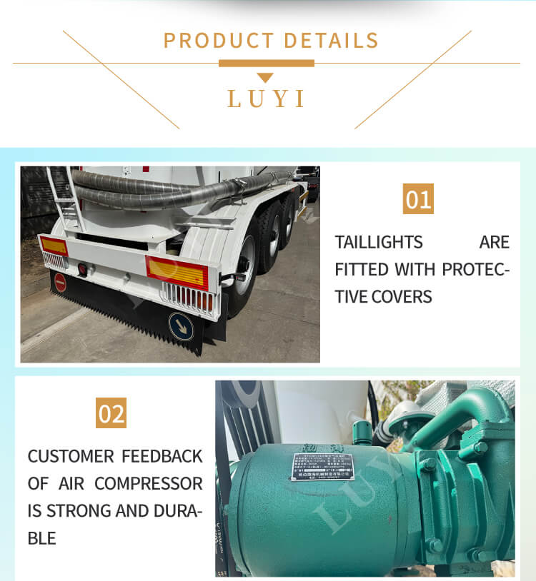 El camión cisterna de cemento LUYI de 3 ejes y 30-60 metros cúbicos, también conocido como camión cisterna para polvo, se origina en la provincia de Shandong, China. Es un semirremolque de alta eficiencia especialmente diseñado para transportar cemento en polvo a granel, satisfaciendo con precisión las necesidades de los escenarios de transporte de carga.