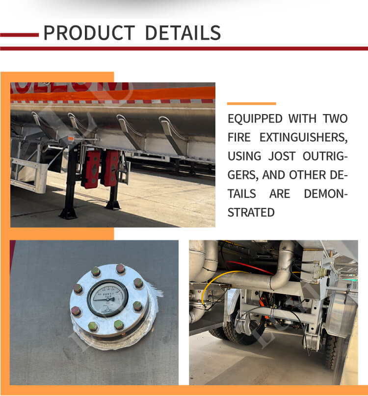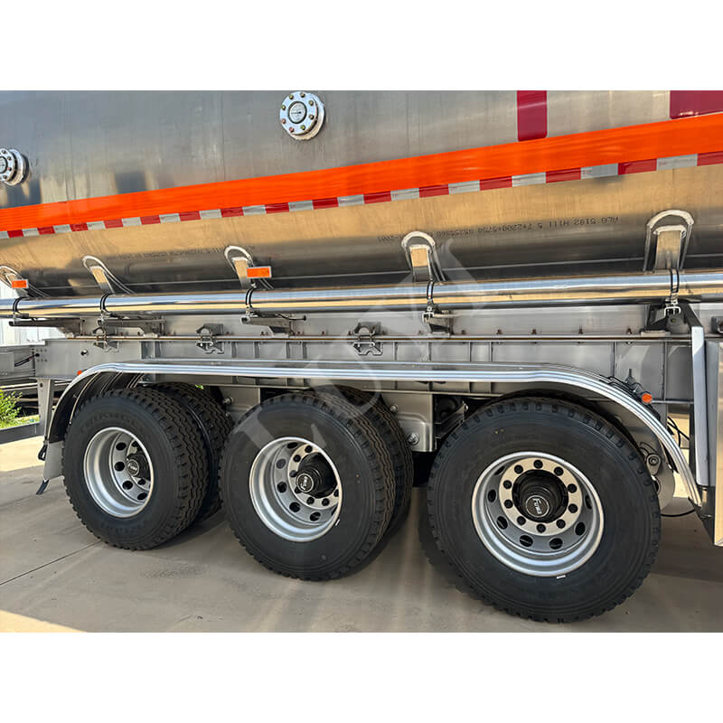 Este semirremolque está equipado con 4 ejes LUYI y su sistema de suspensión ofrece opciones de suspensión mecánica o suspensión neumática. Combinado con neumáticos 12R22.5, garantiza una conducción estable y confiable. Las patas de soporte son de la clase estándar de 28 toneladas y el pivote central está disponible en 2 pulgadas (50 mm) o 3,5 pulgadas (90 mm), lo que proporciona una gran adaptabilidad. Su color se puede personalizar según los requisitos del cliente, combinando practicidad y personalización, lo que lo convierte en una opción ideal en el campo del transporte de combustible.