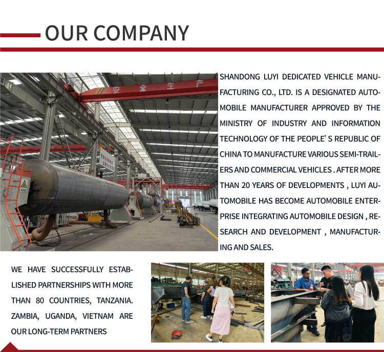 El semirremolque con tanque de petróleo de 40.000 litros de acero al carbono de 3 ejes LUYI, fabricado en la provincia de Shandong, China, es un camión semirremolque eficiente para el transporte de combustible. Construido en acero al carbono, es robusto y duradero, con una carga útil máxima efectiva de más de 30.000 kg y una capacidad de carga que oscila entre 20 y 60 metros cúbicos, capaz de satisfacer diversas necesidades de transporte de combustible.