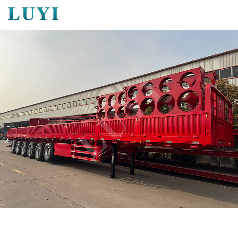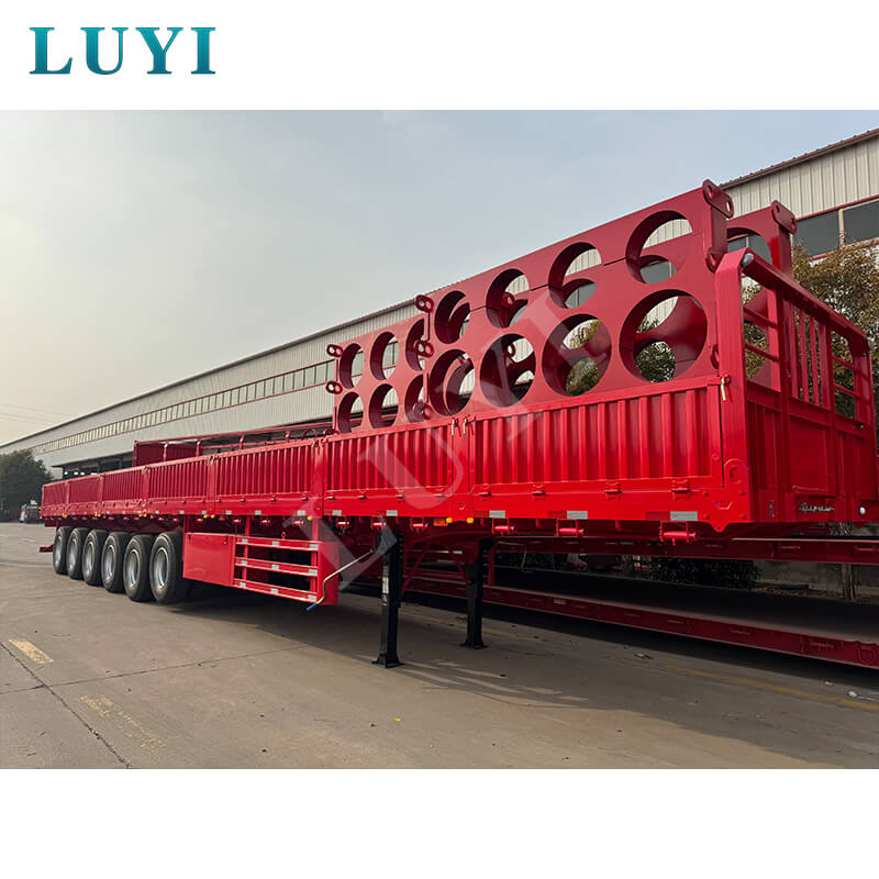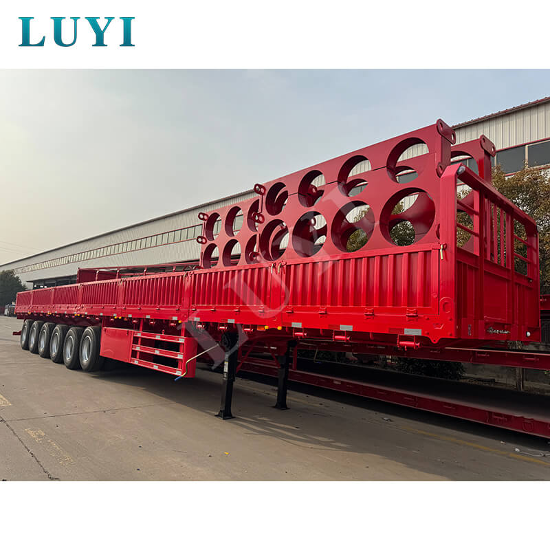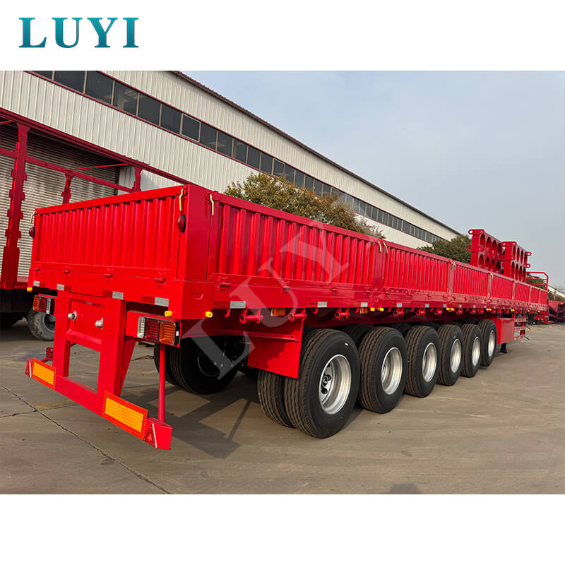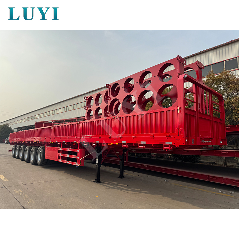 El semirremolque de pared lateral LUYI de 6 ejes, 15,5 m, 80-100 toneladas y 40 pies, también llamado semirremolque de plataforma/tipo estaca, se origina en Shandong, China. Es un semirremolque de alta calidad diseñado para el transporte de contenedores y carga a granel. Fabricado íntegramente en acero, mide 15500x2500x1600 mm y tiene una carga útil máxima efectiva de 60 a 100 toneladas, con una gran capacidad de carga para satisfacer fácilmente las necesidades de transporte de carga pesada.