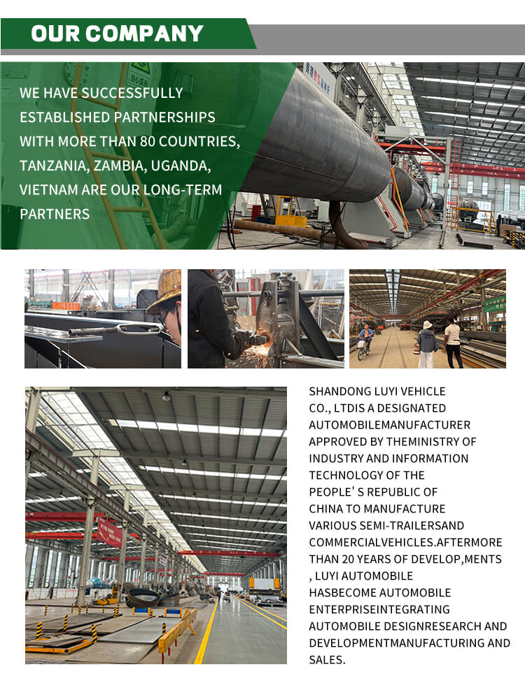 El semirremolque con tanque de combustible de 3 ejes y 60 toneladas LUYI, originario de la base de fabricación de alta calidad en Shandong, China, es un equipo de transporte confiable y eficiente especialmente diseñado para el transporte de petróleo. Todo el vehículo está fabricado en acero de alta resistencia, lo que aporta robustez y durabilidad. Con dimensiones precisas de 12500x2500x3600MM, garantiza flexibilidad de transporte y eficiencia de carga.