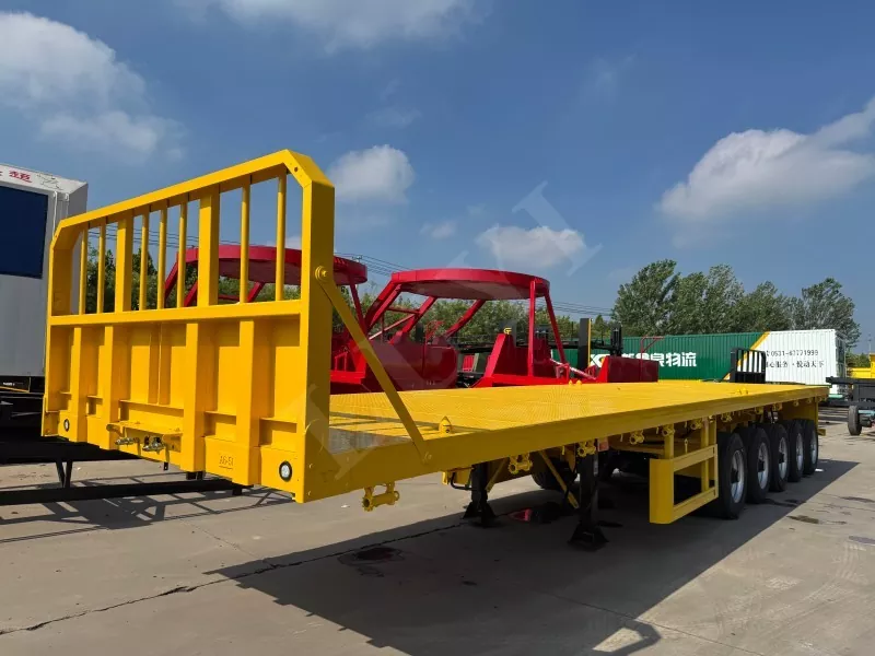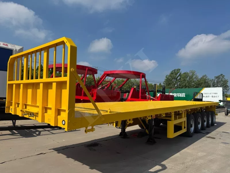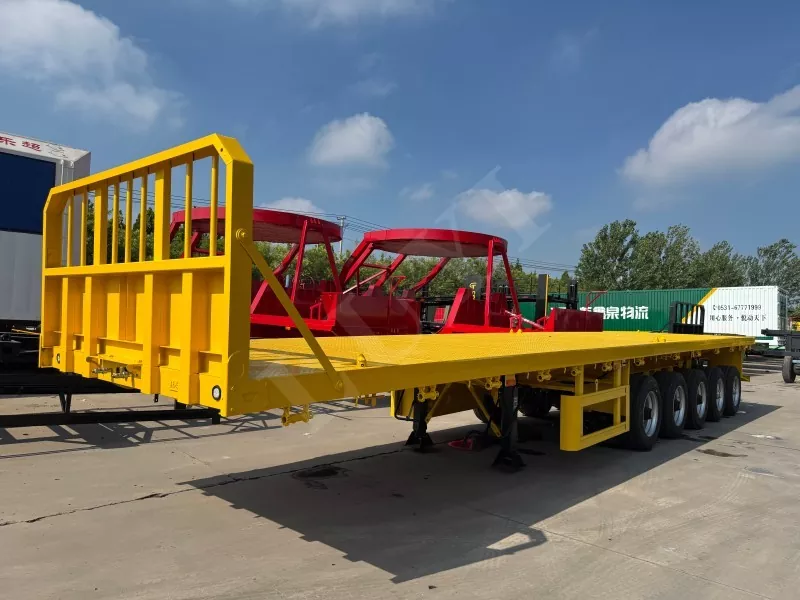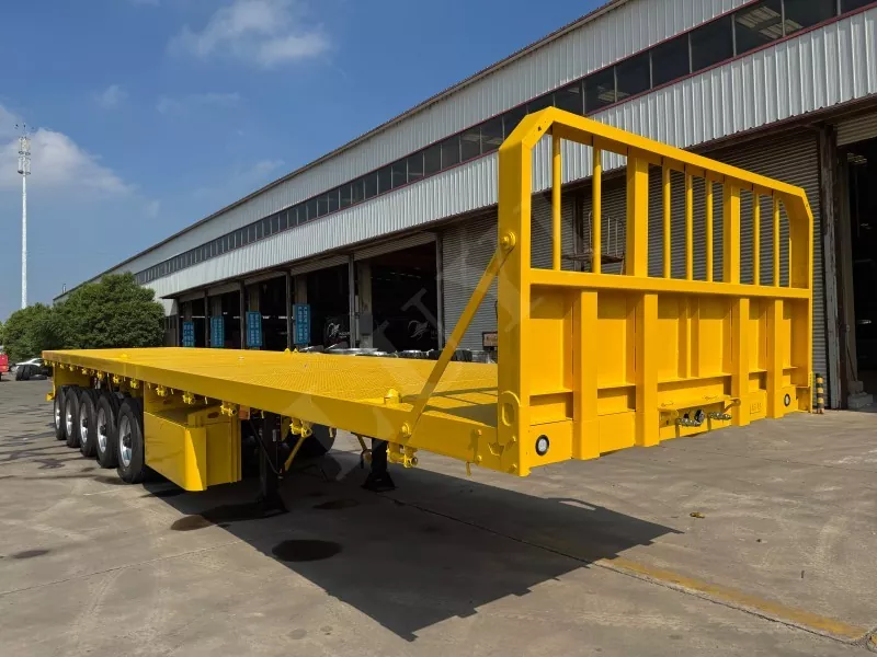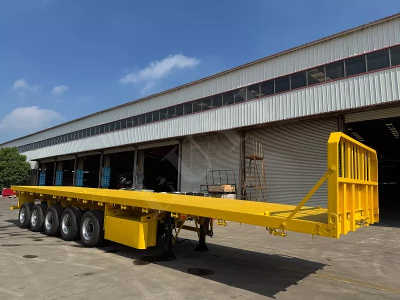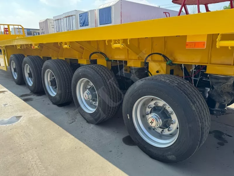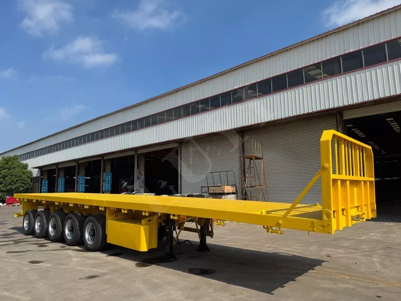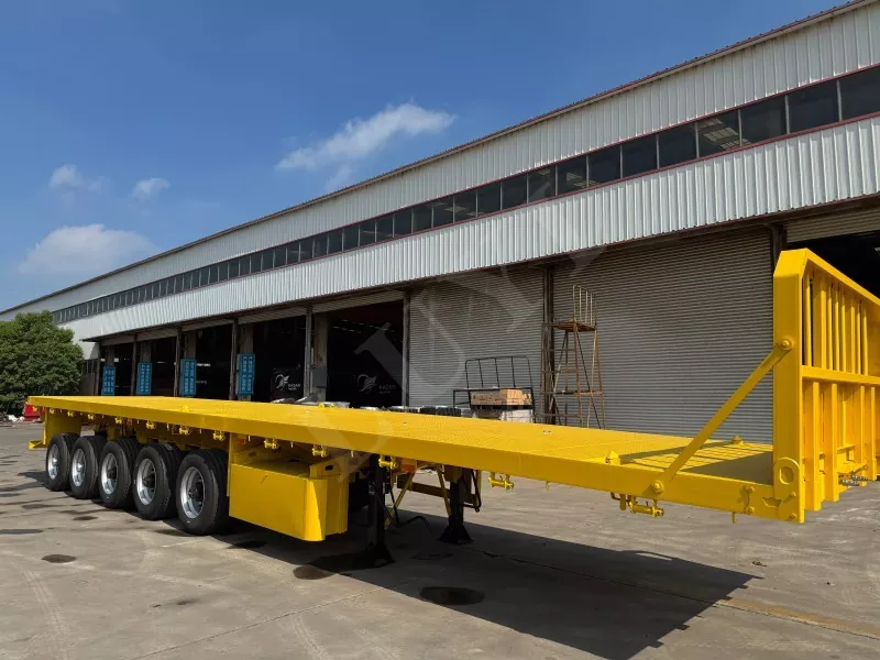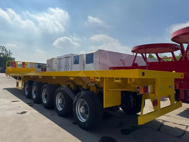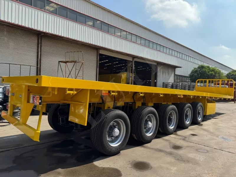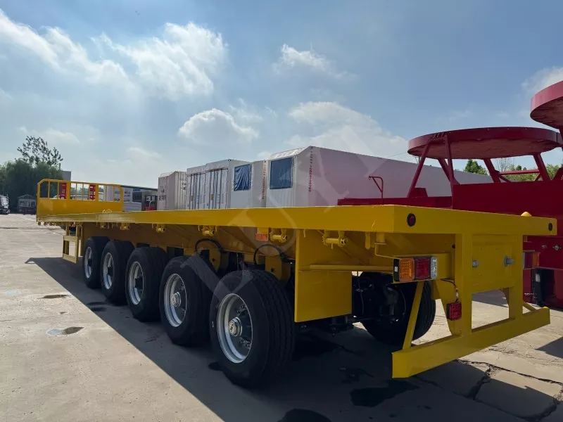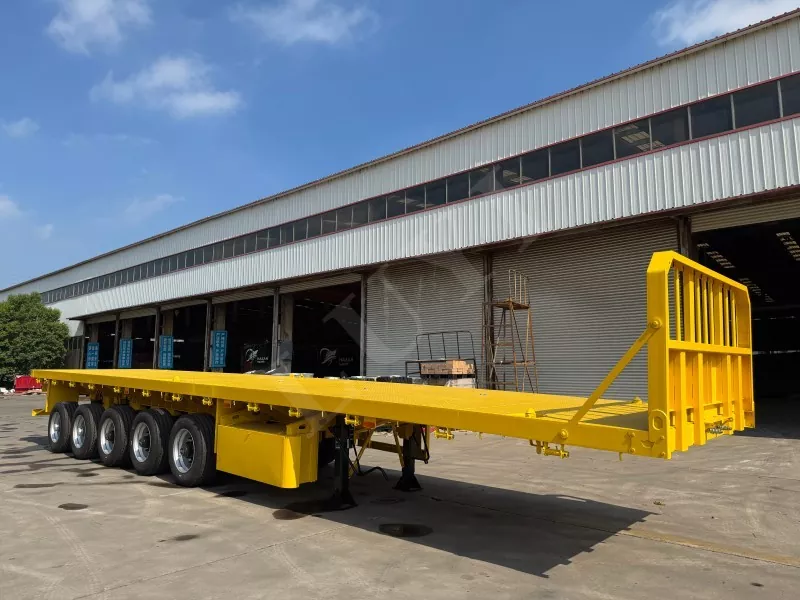 Nuestro semirremolque de plataforma contenedorizado tiene 14,5 metros de largo y 2,5 metros de ancho, con semirremolque de plataforma de 5 ejes, función de dirección de seguimiento CTC en los 2 ejes traseros, capaz de transportar 100 toneladas y equipado con 12 cerraduras para contenedores.