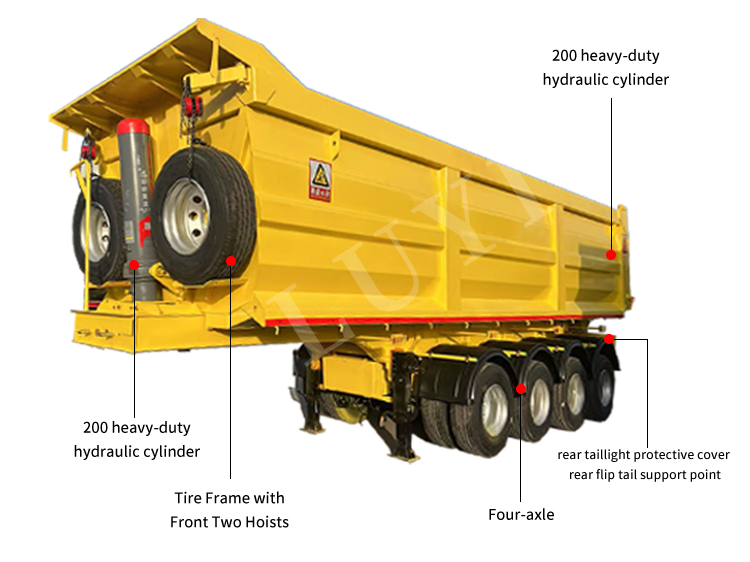 Originario de Shandong, la base de fabricación de alta calidad de China, el semirremolque con volcador trasero de 4 ejes LUYI es un equipo de alta eficiencia diseñado para el transporte pesado de carga a granel. Construido con acero de alta resistencia, combina durabilidad y estabilidad de carga, con una carga útil máxima de 80 toneladas y adaptándose a condiciones de trabajo completas con una capacidad de carga de 60-80 toneladas. Es muy adecuado para el transporte de mercancías a granel a larga distancia, como carbón, arena y minerales.