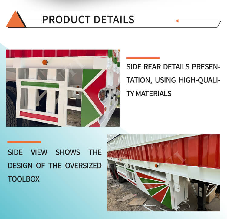 El producto tiene unas dimensiones de 12500×2500×1600 mm, está equipado con 3 ejes (marcas opcionales ZY, Fuhua, BPW) y opciones duales de suspensión mecánica/neumática para garantizar una conducción suave. Se combina con patas de soporte estándar JOST de 28 toneladas y neumáticos con especificaciones 12R22.5/12.00R20/11R22.5, lo que mejora aún más la seguridad en la carga y descarga y la adaptabilidad a las condiciones de la carretera. Además, las ballestas de 90×13×10 mm mejoran la estabilidad de carga y el color se puede personalizar según sea necesario, lo que proporciona una solución personalizada confiable y flexible para logística y transporte.