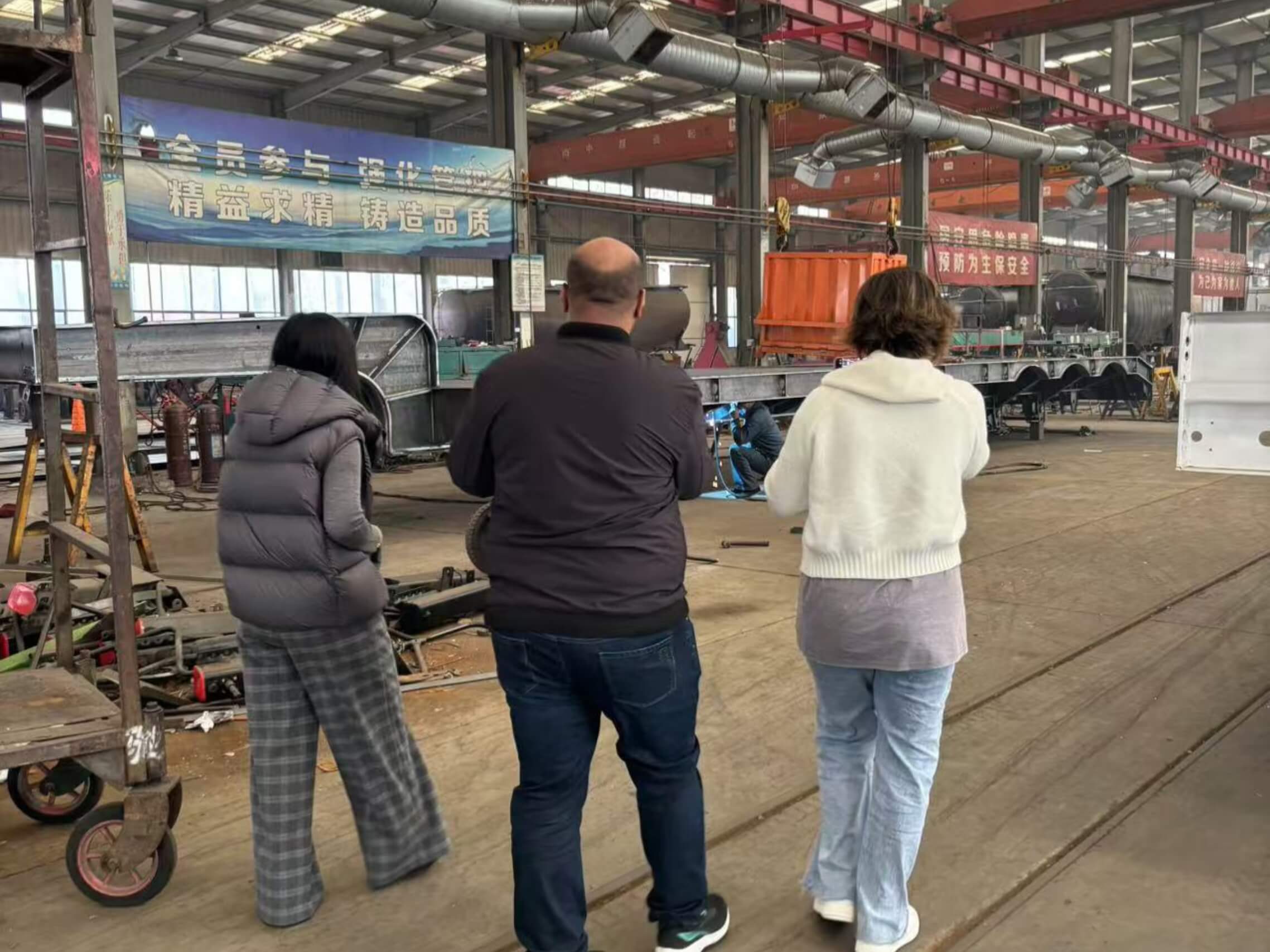 Los clientes argelinos llegaron por primera vez al taller de soldadura de la fábrica de Luyi y se centraron en verificar el proceso de soldadura de marco del semi de lecho plano de tres ejes. Los técnicos de la fábrica de luyi introdujeron que el marco delTres eje semi de cama planaestá hecho de acero de aleación de alta resistencia y soldada por robots automatizados. La fuerza de soldadura ha aumentado en un 30% en comparación con los procesos tradicionales, que pueden satisfacer las necesidades de transporte de carga pesada en las complejas condiciones de carretera en Argelia. Los clientes argelinos inspeccionaron cuidadosamente la suavidad y la firmeza de las soldaduras y afirmaron la precisión de la producción de la fábrica de Luyi.