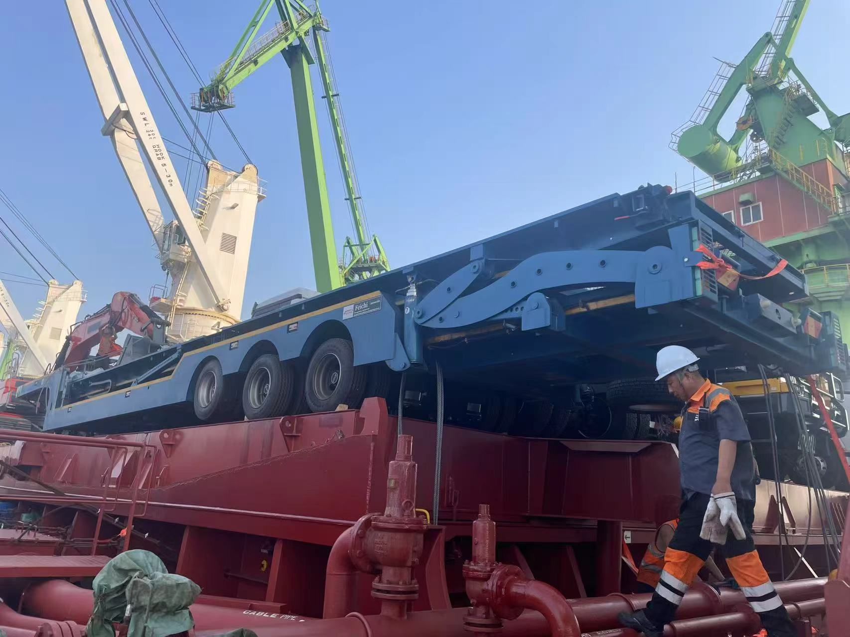 A principios de otoño, un puerto internacional en la provincia de Shandong estaba lleno de actividad. Docenas de LuyiSemirremolques de plataforma de 3 ejes y 4 piesestaban estacionados de manera ordenada en la terminal. Después de pasar por múltiples procedimientos, como inspección aduanera y refuerzo de seguridad, los semirremolques de plataforma fueron elevados lentamente a la bodega de carga de un carguero transoceánico mediante un equipo de elevación profesional. Esta operación de carga marcó el lanzamiento oficial de la cooperación de transporte transfronterizo entre la marca Luyi y los clientes kazajos. Los semirremolques de plataforma Luyi de 3 ejes y 4 pies cruzarán fronteras nacionales para proporcionar soluciones de carga pesada para el sector del transporte de ingeniería en Kazajstán.