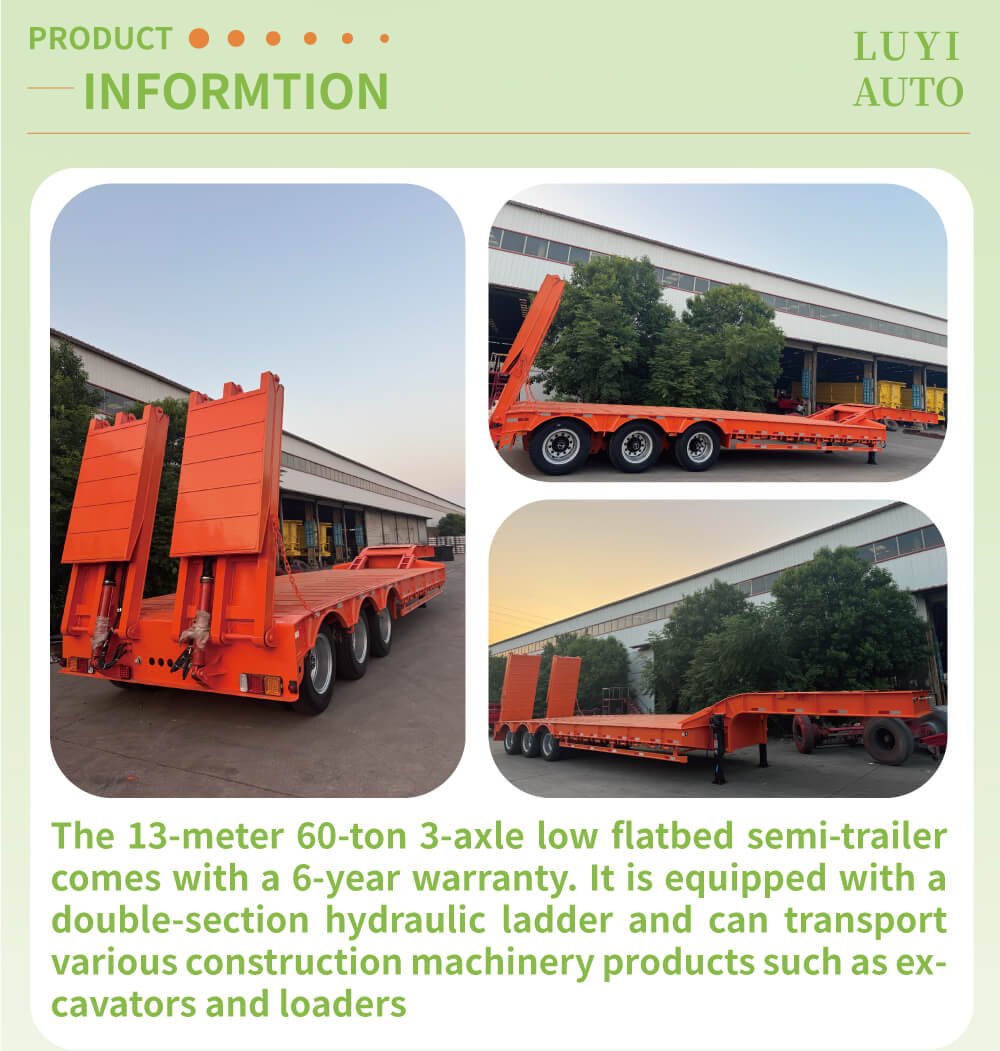 El semirremolque de plataforma baja con cuello de cisne desmontable de 3 ejes y 60 toneladas LUYI, producido en Shandong, China, es un remolque de carga profesional. Su cuerpo está fabricado en acero de alta resistencia, con unas dimensiones de 1700030001500mm. La estructura es robusta y el espacio suficiente, lo que permite cargar de forma estable cargas pesadas y adaptarse a diversas operaciones de tracción de camiones.